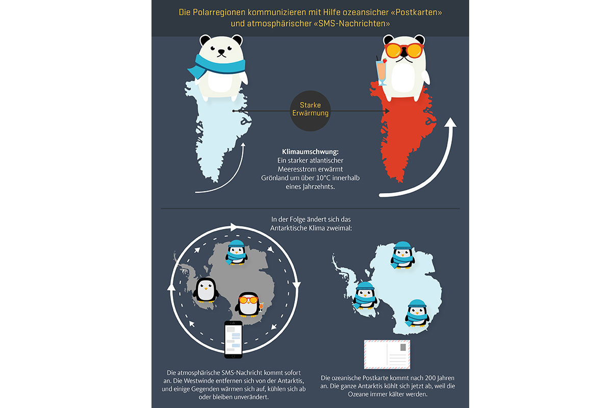 «Die klimatische Verbindung zwischen Nordatlantik und Antarktis, die wir nachgewiesen haben, besteht noch immer», erklärt Michael Sigl. «Der Grund für die gegenwärtige Abschwächung der AMOC sind die globale Erwärmung und Schmelzwasser aus Grönland. Mit anderen Worten: Die SMS wird gerade abgeschickt, die atmosphärischen Bedingungen sind im Ändern begriffen.» Aber auch die «Postkarte», so der Berner Klimaforscher, welche die Veränderungen in den Ozeanen auslösen werde, sei bereits unterwegs.